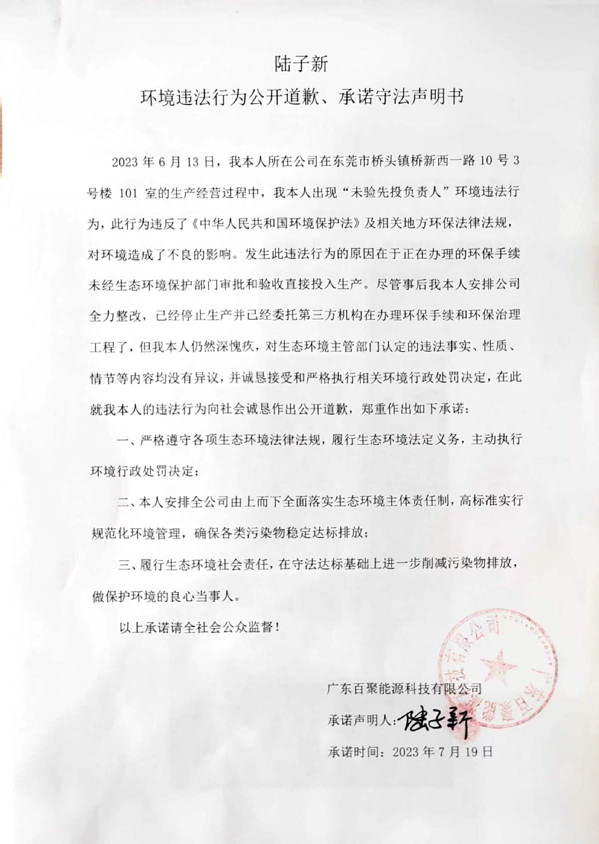 陆子新环境违法行为公开道歉、承诺守法声明书