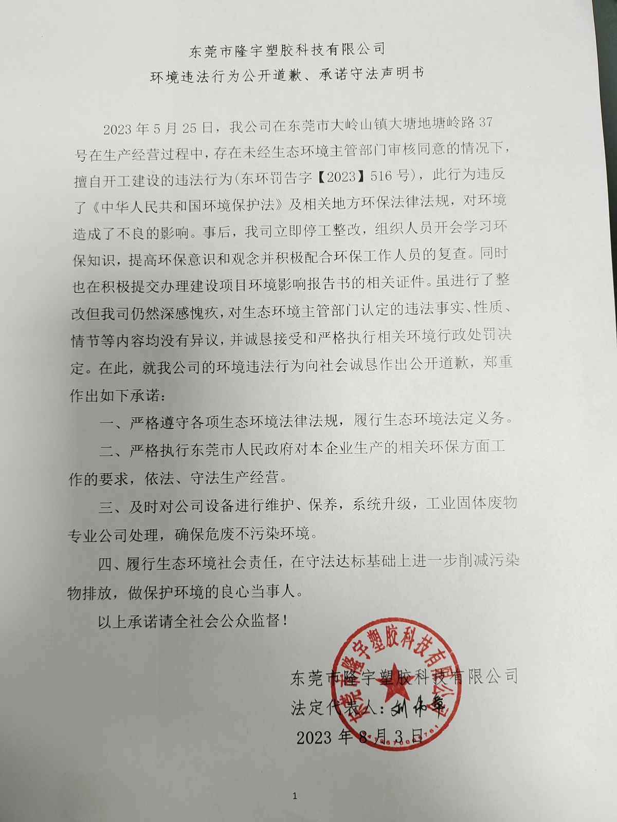 2023年5月25日,我公司在东莞市大岭山镇大塘地塘岭路37号在生产经营过程中,存在未经生态环境主管部门审核同意的情况下,擅自开工建设的违法行为(东环罚告字【2023】516号),此行为违反了《中华人民共和国环境保护法》及相关地方环保法律法规,对环境造成了不良的影响。事后,我司立即停工整改,组织人员开会学习环保知识,提高环保意识和观念并积极配合环保工作人员的复查。同时也在积极提交办理建设项目环境影响报告书的相关证件。虽进行了整改但我司仍然深感愧疚,对生态环境主管部门认定的违法事实、性质、情节等内容均没有异议,并诚恳接受和严格执行相关环境行政处罚决定。在此,就我公司的环境违法行为向社会诚恳作出公开道歉,郑重作出如下承诺: