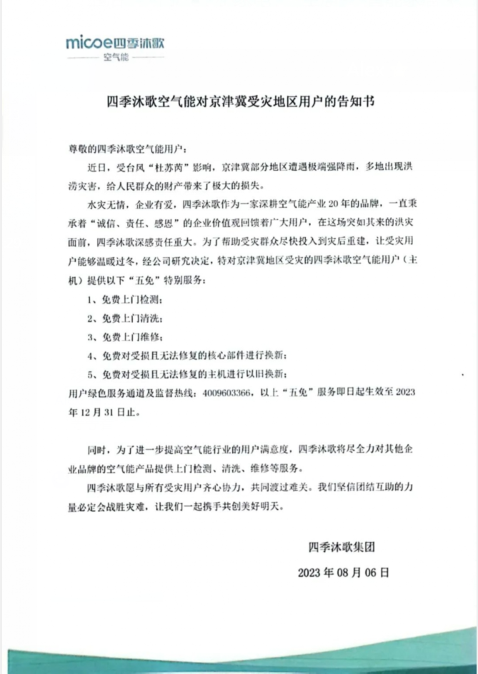 四季沐歌空气能对京津冀受灾地区用户的告知书