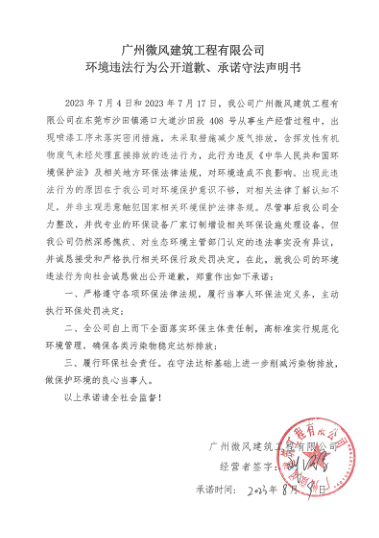 2023年7月4日和2023年7月17日,我公司广州微风建筑工程有限公司在东莞市沙田镇港口大道沙田段408号从事生产经营过程中,出现喷漆工序未落实害闭措施,未采取措施减少废气排放,含挥发性有机物废气未经处理直接排放的违法行为,此行为违反《中华人民共和国环境保护法》及相关地方环保法律法规,对环境造成不良影响。出现此违法行为的原因在于我公司对环境保护意识不够,对相关法律了解认知不足,并非主观恶意触犯国家相关环境保护法律条规。尽管事后我公司全力整改,并找专业的环保设备厂家订制增设相关环保设施处理设备,但我公司仍然深感愧疚、对生态环境主管部门认定的违法事实没有异议,并诚恳接受和严格执行相关环保行政处罚决定,在此,就我公司的环境违法行为向社会诚恳做出公开道歉,郑重作出如下承诺: