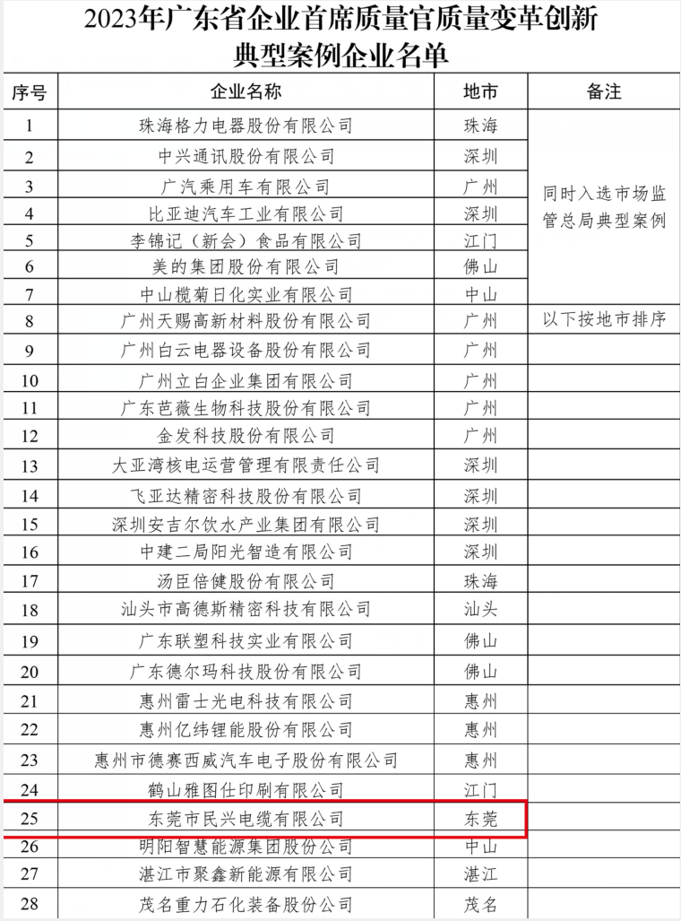 近日,广东省市场监督管理局公布“2023年广东省企业首席质量官质量变革创新典型案例”征集评选活动结果,全省共有30项典型案例入选,东莞市民兴电缆有限公司凭借独特的“3新+5益”质量管理模式与比亚迪、中兴、格力等名企一起荣登榜单。民兴电缆成东莞市唯一入选企业,更是广东省唯一一家入选的电线电缆企业。