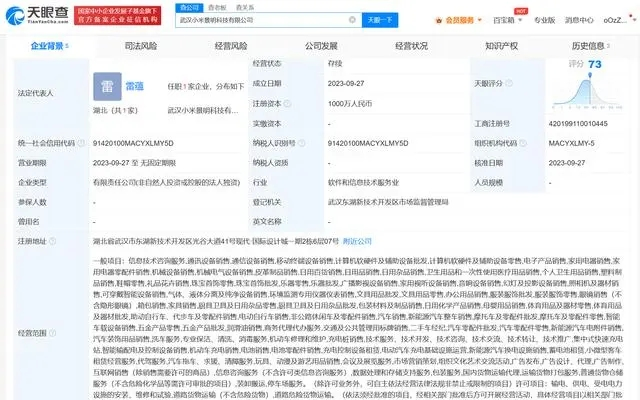 天眼查App显示,9月27日、28日,武汉小米景明科技有限公司、深圳小米景明科技有限公司成立,法定代表人分别为雷蕴、李肖爽,注册资本均为1000万人民币,经营范围均包括电子产品销售、汽车销售、新能源汽车整车销售、二手车经纪、小微型客车租赁经营服务等。股权全景穿透图显示,这2家公司均由小米景明科技有限公司全资持股,后者为小米智能技术有限公司全资子公司。(来源:北晚在线 )