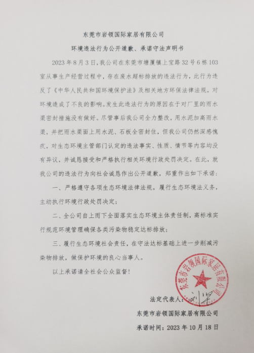 2023年8月3日,我公司在东莞市塘厦镇上宝路32号6栋103 室从事生产经营过程中,存在废水超标排放的违法行为,此行为违反了《中华人民共和国环境保护法》及相关地方环保法律法规,对环境造成了不良的影响。发生此违法行为的原因在于对厂里的雨水渠密封措施没有做好。尽管事后我公司全力整改,用水泥加高雨水渠,并把雨水渠面上用水泥、石板全密封住,但我公司仍然深感愧疚,对生态环境主管部门认定的违法事实、性质、情节等内容均没有异议,并诚恳接受和严格执行相关环境行政处罚决定。在此,就我公司的违法行为向社会诚恳作出公开道歉,郑重作出如下承诺: