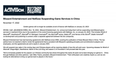 2022-11-18 15:09:19 | 企业11月16日,暴雪娱乐在动视暴雪投资者官网发布声明称,与网易公司目前的授权协议将于2023年1月23日到期,届...