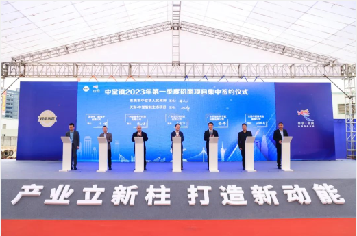 3月28日,“产业立新柱 打造新动能”中堂镇2023年第一季度招商项目集中签约暨市重大项目友华新材料动工仪式举行,掀起新一轮招商引资和项目建设热潮。该镇此次集中签约的15宗项目,涉及高端装备制造、新材料、新一代电子信息等产业领域,预计新增年总产值不低于34.3亿元。同时友华新材料项目也于当天动工,计划总投资2.03亿元,预计2024年建成投产。中堂镇党委副书记、镇长曾庆云表示,这批项目的成功签约及后续落地,对优化中堂产业结构、推动制造业高质量发展具有重要意义。