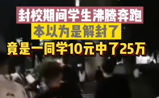 据悉,该学生花了10元买彩票中奖25万,引起了全校的沸腾庆祝,不少人狂奔来围观,很多不知情的人还以为是校园解封了,让校园一下子恢复了昔日热闹的样子。
