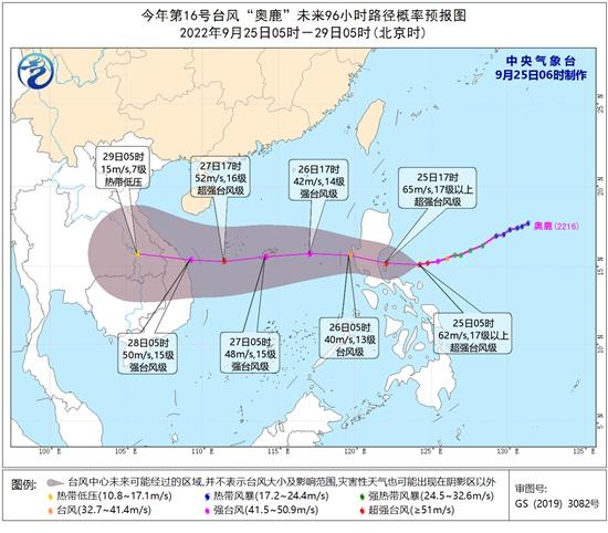 预计,“奥鹿”将以每小时20公里左右的速度向偏西方向移动,将于今天傍晚到夜间在菲律宾吕宋岛登陆(58-65米/秒,17级或17级以上,超强台风级),将穿过吕宋岛,强度有所减弱,并于26日早晨进入南海中部偏东海域,逐渐向越南东部沿海靠近,强度有所加强,将于28日凌晨到上午在越南东部沿海登陆(48-52米/秒,15-16级,强台风级或超强台风级),登陆后强度快速减弱。