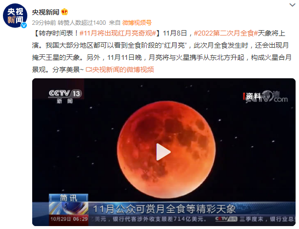 11月8日,2022第二次月全食天象将上演。我国大部分地区都可以看到全食阶段的“红月亮”,此次月全食发生时,还会出现月掩天王星的天象。另外,11月11日晚,月亮将与火星携手从东北方升起,构成火星合月景观。分享美景~