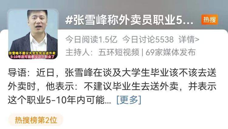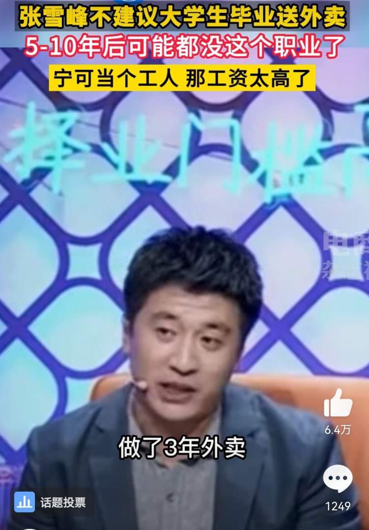 另外,张雪峰断言,外卖员这个职业5-10年内可能会消失。
