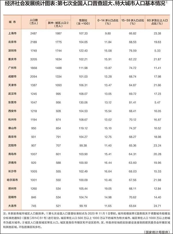 根据国家统计局《经济社会发展统计图表:第七次全国人口普查超大、特大城市人口基本情况》,超大城市有上海、北京、深圳、重庆、广州、成都、天津7城。特大城市共14座,分别是武汉、东莞、西安、杭州、佛山、南京、沈阳、青岛、济南、长沙、哈尔滨、郑州、昆明、大连。(超大、特大城市均按城区人口数排序。)其中,武汉距超大城市的门槛1000万人仅有5万人之差。
