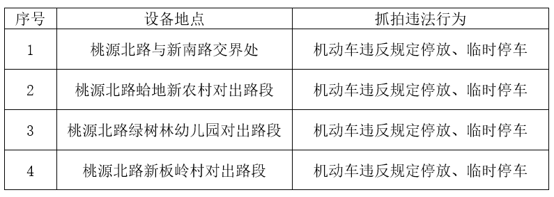 为加强辖区道路交通管控,预防和减少交通事故发生,保障道路交通安全、有序、畅通,根据《中华人民共和国道路交通安全法》及其配套法规,南城交警大队将在南城街道桃源北路新增4个固定式交通技术监控设备,对机动车违法停放行为进行抓拍。现将新增电子警察设置地点予以公告: