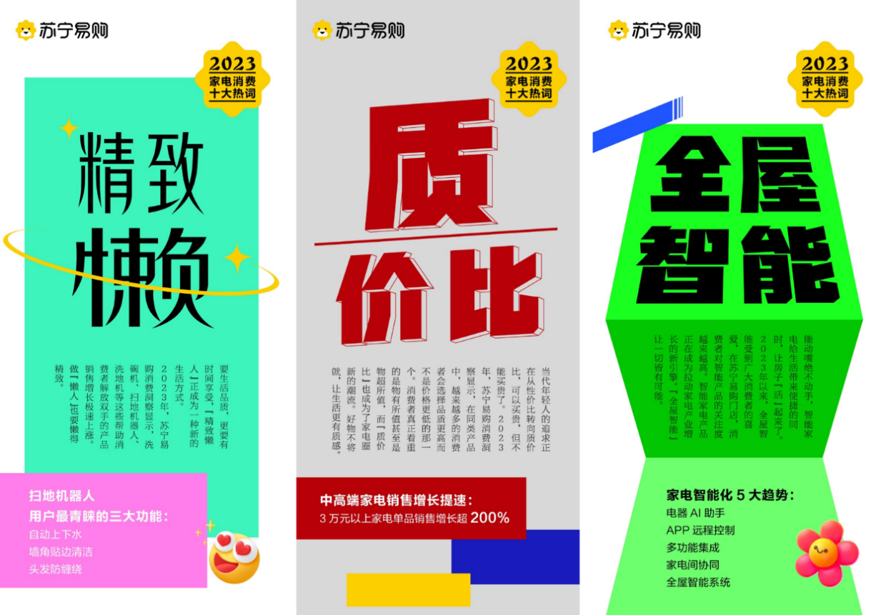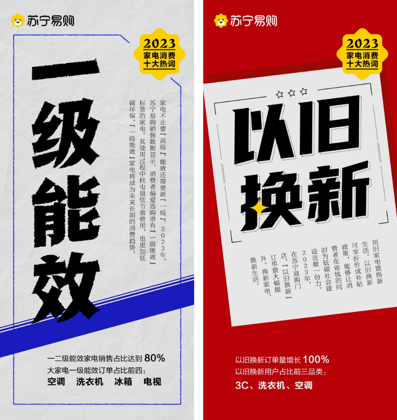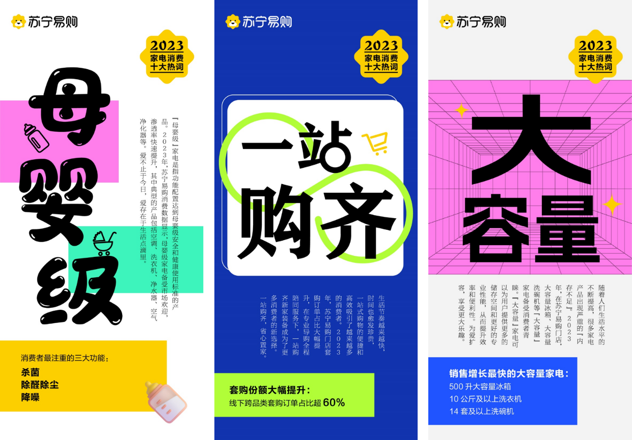 除此之外,随着消费者对健康生活和快捷购物需求的提升,“母婴级”“一站购齐”和“大容量”也成为2023年度家电消费热词。苏宁易购消费数据显示,2023年“母婴级”家电备受市场欢迎,渗透率快速提升,杀菌、除醛除尘、降噪成为消费者最关注的三大功能。为了能够省心、省时完成全屋家电购置,套购订单占比大幅提升,苏宁易购线下跨品类套购订单占比超60%,一站购齐新家装备成为了更多消费者的新选择。苏宁易购表示,将持续聚焦用户“家消费”升级需求,加大优质商品供给、提升场景体验、强化服务能力,以好商品、好价格、好服务挖掘消费新增量。