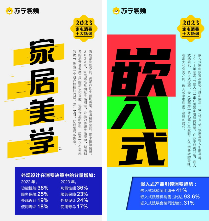 在“颜值经济”“悦己消费”时代,“感知美、欣赏美、创造美”已成为消费者追求生活美学的态度,外观设计在家电消费决策中的分量增加。一体化家居美学的盛行,让“嵌入式”家电逐渐成为家庭装修、家电选购的热点话题。2023年以来,在苏宁易购门店,嵌入式产品销售增长迅速提升,嵌入式冰箱、嵌入式洗烘套装销售同比增长分别达到了41%和31%,嵌入式洗碗机销售占比高达93.6%。