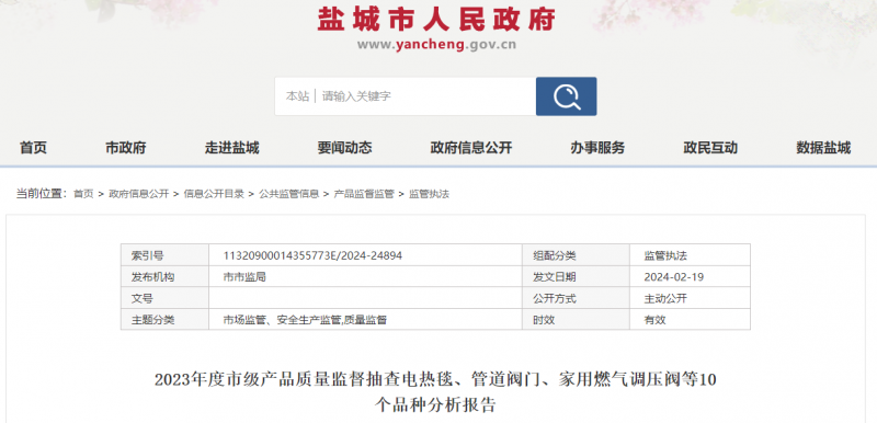2023年度盐城市市场监督管理局委托盐城市产品质量监督检验所组织实施电热毯产品市级监督抽查。本次抽查计划5批次,抽到5批次,经检验合格4批次,不合格1批次,不合格项目为机械强度。(来源:盐城市人民政府网站 )