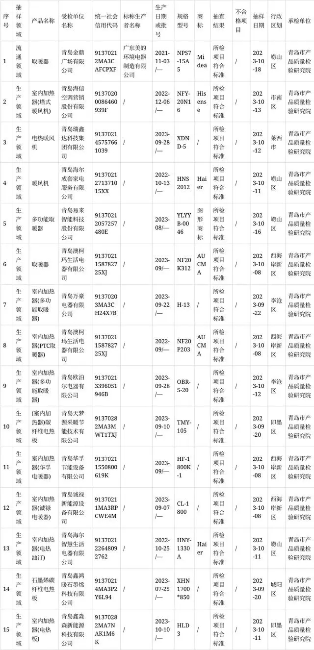 青岛市公布2023年室内加热器产品质量市级监督抽查结果
