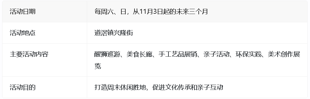 从11月3日起的未来三个月,每周六、日,道滘镇兴隆街都将变身为一个集美食、手工艺、亲子活动于一体的周末休闲胜地。当天,随着鼓声和锣声,两条威武的醒狮在街上巡游,与小朋友们互动,为老街增添了传统韵味和喜庆氛围。整条街被黄色小摊档装点得热闹非凡,美食、手工艺品琳琅满目。此外,还举行了一系列趣味活动,如亲子游园、环保实践等。一群美术爱好者还以兴隆街为背景进行创作,画作将在道滘镇新时代文明实践中心展览。主办方诚邀广大市民前来感受热闹与温馨,共享快乐时光。
