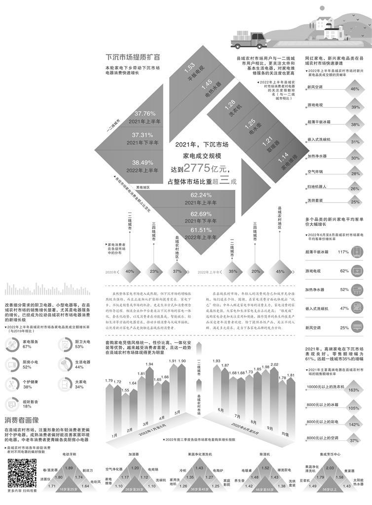 对新品的追求,始终是市场的主旋律。科技水平的提升、生活观念和消费理念的变化,促进家电向品质、绿色、智能、健康、便捷等方向转型,智能投影、扫地机器人、洗地机等满足不同使用场景需求的新品层出不穷,结构升级成为新增长点。数据显示,下沉市场消费者对新兴家电品类的接受度更高、普及速度更快,高端冰洗、彩电等零售额增幅均高于北上广等一线城市,展现出巨大的消费升级潜力。