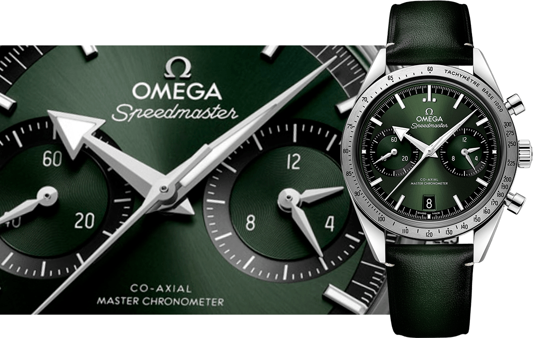 一眼相中这枚「金绿」配色的 38 毫米同轴计时表,黄色 18K 金表壳,用到双重表圈的设计,一圈是镶钻,一圈是带有测速刻度的绿色铝质圆环。