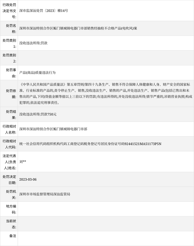 近日,深圳市市场监督管理局深汕监管局公布一条行政处罚信息,涉及深圳市深汕特别合作区鲘门镇城锦电器门市部销售经抽检不合格产品(电吹风)案。具体信息如下: