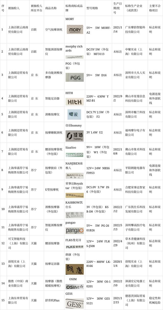近日,上海市市场监管局发布按摩器具监督抽查情况。
