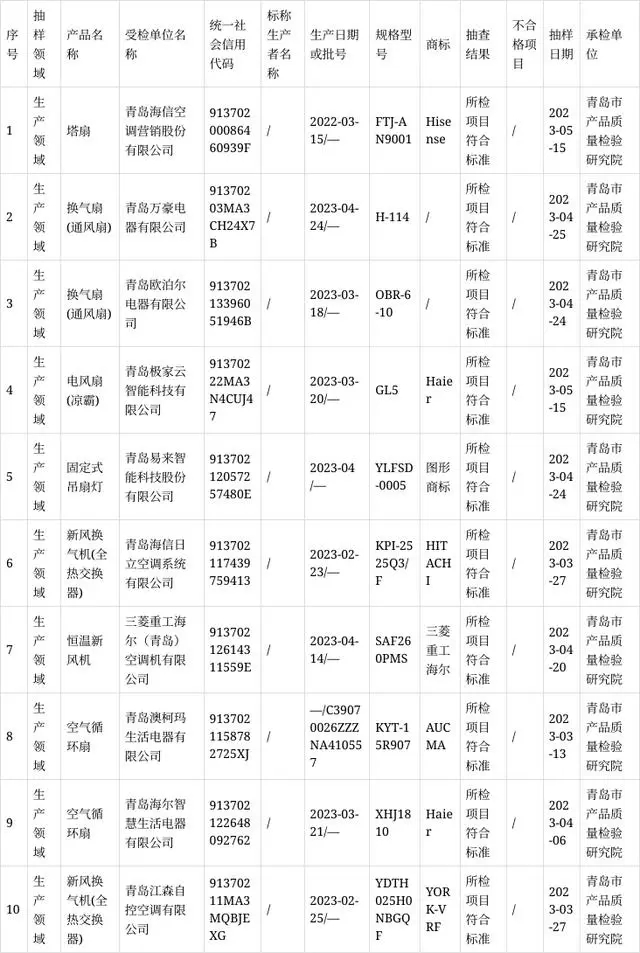 青岛市2023年电风扇产品质量市监督抽查结果公布