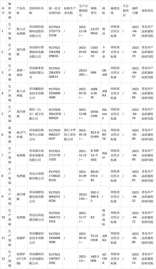 近日,青岛市市场监督管理局公布2023年电烤箱及烘烤器具产品质量市监督抽查结果。