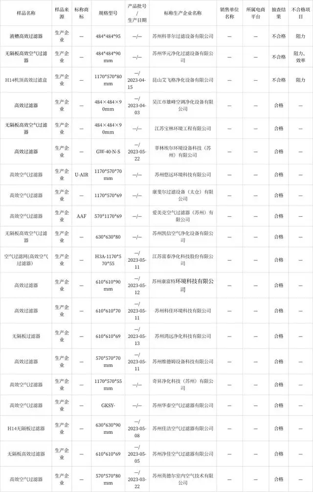 近日,苏州市市场监督管理局发布2023年高效空气过滤器产品质量市级监督抽查情况公告(第64期)。