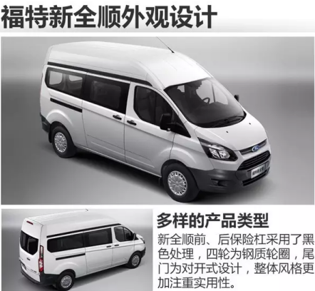 新款全顺采用了与国产全新MPV——途睿欧的造型风格,由于定位的不同,两款车在外观细节方面有所不同。新全顺前、后保险杠采用了黑色处理,四轮为钢质轮圈,尾门为对开式设计,整体风格更加注重实用性。目前全顺系列拥有多样的产品类型,包括短轴版和长轴版,而车顶也分多种。
