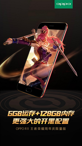 9月20日,OPPO官微公布OPPO R11王者荣耀周年限量版6GB运存+128GB 内存的黄金配置组合,将为用户带来更酣畅淋漓的游戏体验。