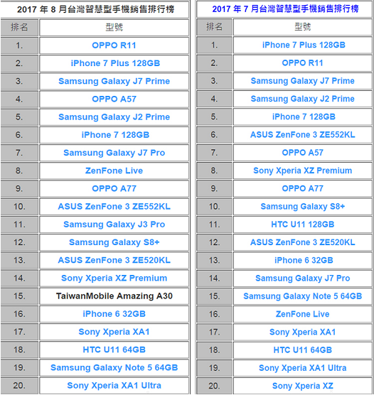 由于2017年下半年新机还没发布,所以8月份智能手机排名并没有新面孔,最新的是6月中旬发布的OPPO R11,其实,7月份R11在台湾市场的销量就相当出色,上是一个月就在安卓机型中排名第一。8月份的销量则更上一层楼,在台湾智能手机中排名第一,成为8月份最畅销的机型。
