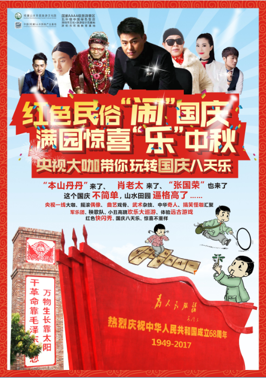 “本山丹丹”来了,肖老太来了,“张国荣”也来了,这个国庆不简单,观澜山水田园逼格高了……央视一线明星大咖、摇滚偶像、曲艺戏骨、武术杂技、中华奇人、搞笑怪咖汇聚,让您零距离感受央视高大上、欢乐笑开怀;军乐团、秧歌队、小丑高跷欢乐大巡游,红色快闪秀,打弹弓、跳房子、踢毽子、滚铁环、扳手腕、呼啦圈等远古游戏竞技体验,带你回归父辈欢乐童年,国庆八天乐、惊喜不重样,将给广大市民精心烹制一台文化欢乐的盛宴!