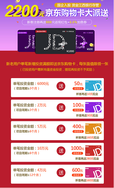 庆予财宝新版官网4.0升级上线,新老用户活动期间内新增单笔投资满额即送京东购物卡,每人最高可获2200元,新客参与再返888元现金红包。活动时间截止10月15日。