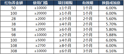 普汇云通的红包设计非常人性化,投资不同期限、不同金额均可使用对应的新手红包。同时,红包券的有效期也不同,能够尽可能的保证投资人使用完所有红包。把红包券金额换算成加息力度,可以看到每张红包券的加息力度都在6%左右,使用红包券非常划算。除了新手红包,平台还给了新手其他福利。例如,年化收益率15%的新手标、7天内投资免除投资服务费、1.5%的加息券、5888元体验金。