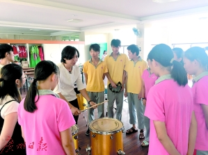 这是陈建敏夫妇正在给孩子们上课,他们夫妇俩都有分工,陈建敏负责传授音乐知识教孩子们打鼓,而陈建敏的妻子则会细心观察孩子们的动作是否有不到位的,帮他们调整、更正。