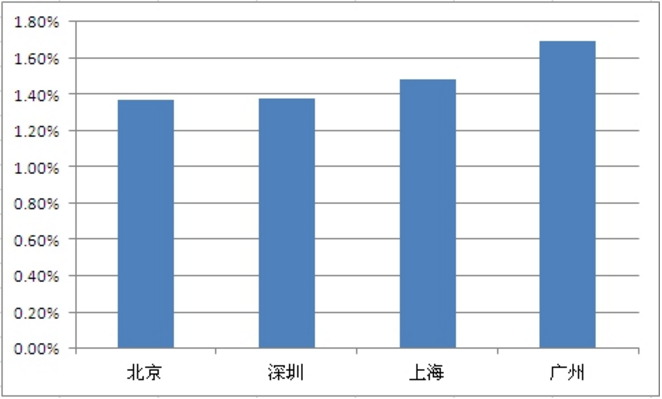 最近,智谷趋势对中国100座一到四线城市的房价和租金进行调查得出,中国100个城市的净租金回报率(即年租金/房价)仅有4座城市在4%以上,65%的城市净租金回报率在3%以下。一般净租金回报率在4%左右视为高回报,而中国城市的租金回报率普遍较低。尤其是四个一线城市全部低于在1.5%左右,位于回报率最低的行列,这与房价虚高不无关系。虽然城市越大,租金回报率越低,是全球通行的规律,但中国却背离的有些离谱。