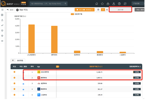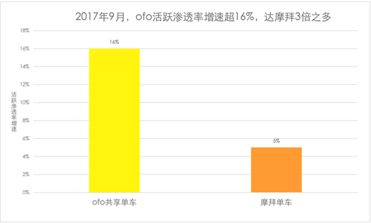 另外,QuestMobile数据还显示,在中国整个App市场活跃渗透率方面,ofo9月活跃渗透率为3.94%,环比增长近16%,位居共享单车行业第一;摩拜活跃渗透率为3.75%,环比增长5%,位居行业第二。数据对比可知,ofo的活跃渗透率增速是摩拜的3倍之多。同时,ofo9月的月活用户规模环比上涨16.5%,其活跃用户规模增速也是摩拜的3倍。