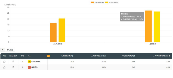 此外,在人均使用天数、人均使用时长等方面,摩拜单车仍旧位列榜首。QuestMobile数据显示,9月份摩拜单车用户的人均使用天数达6.66天,领先于ofo用户的5.48天;摩拜单车用户的人均使用时长达35.34分钟,同样超过ofo用户的27.14分钟。