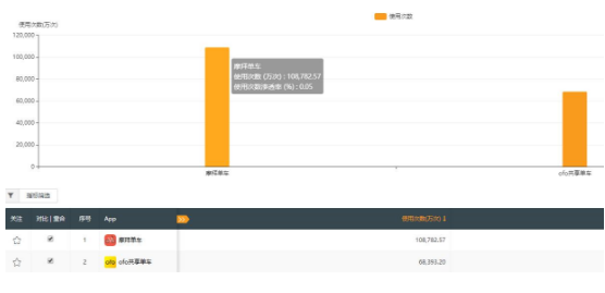 除了使用时长方面之外,QuestMobile还显示,9月份摩拜单车APP的总使用次数排名第一,高达10.9亿次,ofo小黄车则为6.8亿次,不敌摩拜单车。摩拜领先ofo幅度较大,为60%。在APP日均使用次数方面,摩拜单车以3626万次仍旧领先ofo的2280万次,摩拜领先幅度达59%。