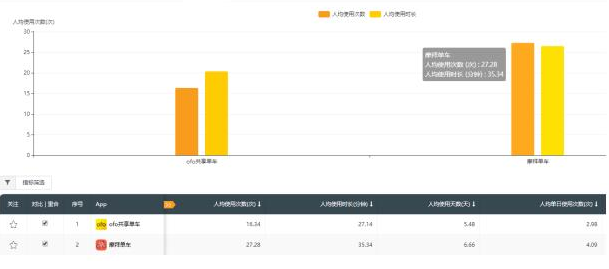 在人均数据方面,摩拜9月人均使用次数达到27.28次,ofo小黄车为16.34次,摩拜领先超10次,领先幅度达67%;摩拜9月人均单日使用次数达到4.09次,ofo小黄车为2.98次,摩拜领先超1次,领先幅度达37%。