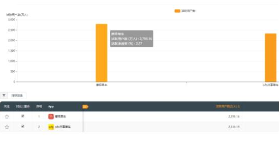 首先是活跃用户量数据,摩拜在10月第一周活跃用户总量为2798万,ofo的活跃用户总量为2336万,可以看出摩拜领先超450万人,并且领先幅度达20%。