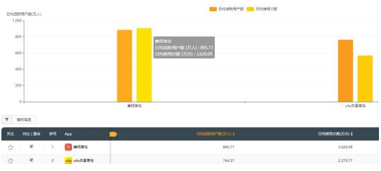 同时还可通过日均维度来测量,在9月的日均活跃量用户数据上,摩拜日均共计886万,ofo则为764万,其中摩拜领先超120万,领先幅度达16%。