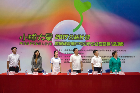 10月21日上午,庄严的国歌声中,由中国青年创业就业基金会、宝成国际集团、国球舍联合主办、裕元创新创业公益基金资助支持、深圳市深大乒乓球俱乐部、深圳大学师范学院附属中学承办的2017小球大爱公益计划暨国球舍杯乒乓少年公益巡回赛深圳站在深大附中高中部体育馆正式启动。