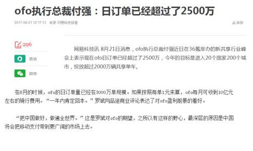 无论从哪方面来看,ofo都无法坐实自己日订单量第一的地位,更何况还有自己前后自相矛盾的公关数据。8月21日,ofo执行总裁付强在36氪举办的新共享行业峰会上表示现在ofo日订单已经超过了2500万。有趣的是,8月15日,在品途商业评论主办的“品途FBI沙龙——共享经济新物种”活动中,金沙江创投罗斌在接受媒体采访时却对外表示,“在6月的时候,ofo的日订单量已经在3000万单规模。”