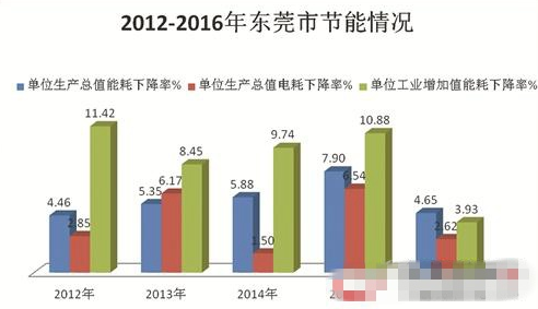 市统计局数据显示,2016年,东莞全社会能源消费量2894.92万吨标准煤,单位GDP能耗0.427吨标准煤/万元,比2012年累计下降21.8%,年均下降6.0%,降幅居全省第一位。电耗方面,也有不俗的成绩。2016年,单位生产总值电耗比2012年累计降低15.9%,年均下降4.2%。