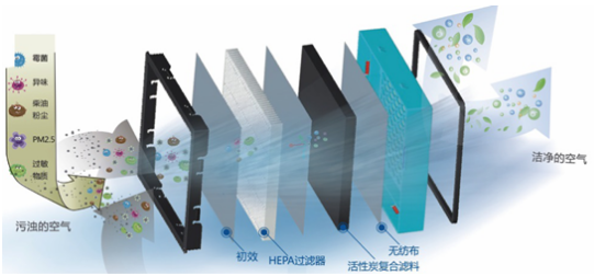 该空气净化器拥有初效、HEPA过滤、活性炭复合滤料、无纺布四层过滤系统,对颗粒物进行离子化,使得精化率高达99%,并且可以永续净化车内空气。HEPA是目前世界上最好的高密度滤材,针对0.3um以上的颗粒粉尘能达到99.97%的过滤效果,对烟尘、悬浮颗粒、细菌、病毒有很强的净化作用。同时,该净化器还具有活性炭混合滤料强吸附技术、等离子技术、粉尘吸附技术,高效祛除空气中的异味物质,尤其是其特有的低温恒量等离子专利技术,可在常温常压下向空间循环释放等离子群,电离空气中的O2和H₂O形成大量的氧原子(O)和羟基(OH),等离子可迅速破坏细菌、病毒等微生物的内部结构,对各种致病微生物有较强的杀灭作用,使得空气变得更为清新,提升车内空气质量。