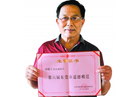 一个月前,刘建江被评为了第六届东莞市道德模范,在颁奖仪式上,年幼的少先队员用淳朴的声音向他喊出了“你的脉管里,流淌着仁者爱人的精神血脉;善举间,闪耀着舍己为人的道德光辉”的致敬词,这让刘建江无比感动。回到家后,他把在颁奖仪式上所获得的绶带、证书和奖牌整理好放到了家里最好的柜子里,同这些荣誉一同摆放在一起的,还有厚厚的一沓献血证。