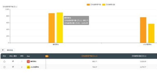 在活跃用户量方面,摩拜10月第一周周活跃用户量为2798万,ofo小黄车为2336万,摩拜领先超450万人,领先幅度达20%。9月日均活跃用户量方面,摩拜单车为886万,ofo小黄车为764万,摩拜领先超120万,领先幅度达16%。