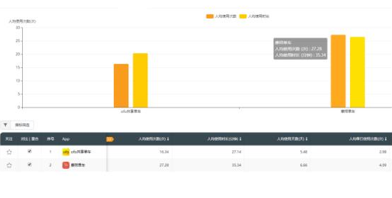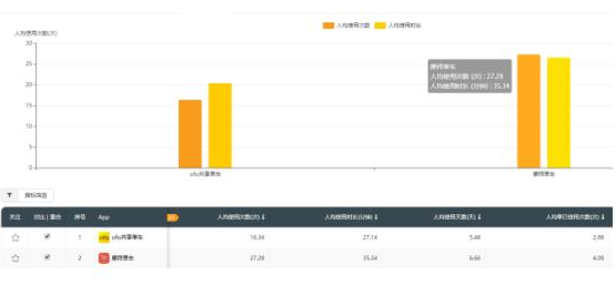 在APP使用时长方面,摩拜9月使用时长为14.1亿分钟,ofo小黄车为11.4亿分钟,摩拜领先超3亿分钟,领先幅度达24%;摩拜9月人均使用时长为35.34分钟,ofo小黄车为27.14分钟,摩拜领先超8分钟,领先幅度达30%;摩拜人均使用天数为6.66天,ofo小黄车为5.48天,摩拜领先超1天,领先幅度 达22%。