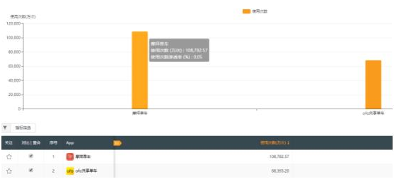QuestMobile数据显示,摩拜9月份APP的总使用次数高达10.9亿次,ofo则为6.8亿次,摩拜单车大幅领先,是ofo的1.6倍。在APP日均使用次数方面,摩拜单车为3626万次,ofo则为2280万次,摩拜领先幅度达59%。