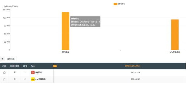 据QuestMobile数据报告显示,今年9月,全体摩拜单车用户的总使用时间长达14.1亿分钟,而ofo用户为11.4亿分钟,摩拜领先超3亿分钟,领先幅度达24%;摩拜单车用户的人均使用时长达35.34分钟,同样超过ofo用户的27.14分钟;人均使用天数摩拜也达6.66天,领先于ofo 5.48天。